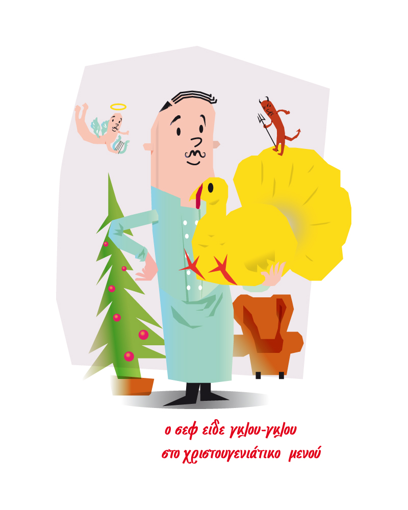 DinoHajiyorgi Posted December 15, 2011 Share Posted December 15, 2011 Μια φορά κι έναν καιρό, ένα Χριστουγεννιάτικο παραμύθι τελείωσε ευτυχισμένα, με έναν σεφ να χαρίζει την ζωή σε μια γαλοπούλα, σερβίροντας στη θέση της, ως κύριο πιάτο, καραμελωμένα ραπανάκια. Ήταν το επίσημο δείπνο του Δημαρχείου και έκανε τέτοια εντύπωση, που όλοι γλύφανε τα δάχτυλα τους για καιρό. Κι ας κατσούφιασε ο Δήμαρχος που έχασε το ζουμερό μπούτι γαλοπούλας με την τραγανή πετσούλα που ονειρευόταν. Ο αξιότιμος εκείνος σεφ, ο Σουπλέ ντε Πεστλέ Μπον Μανιφίκ, δεν χάρισε απλά τη ζωή στον Λε Γκλου-γκλού, γιατί γαλοπούλος ήταν η γαλοπούλα, τον πήρε και στο σπίτι του σαν κατοικίδιο. Ευτυχής ο γάλος λοιπόν, έβοσκε στον κήπο της βίλας του αφεντικού του, ξεσήκωνε την γειτονιά με τα «γκλου-γκλού» του, και κοιμόταν στο σαλόνι παρακαλώ, πάνω σε ένα μεταξωτό μαξιλαράκι δίπλα στο τζάκι. Ήταν μια αρμονική συνύπαρξη, μια ιδανική φιλία πτηνού και ανθρώπου, και όταν τον ρωτούσαν απορημένοι, ο σεφ απαντούσε σιβυλλικά, «κατανοούμε ο ένας τον άλλον.» Πέρασαν όμως πολλά Χριστούγεννα από τότε. Ήρθαν τα τωρινά, τα μαύρα. Φτώχια έπεσε στη χώρα και ο σεφ ήταν άνεργος και άπορος. Ο χειμώνας είχε έρθει τσουχτερός, και η βίλα που κατέρρεε σιγά-σιγά, έμπαζε κρύο από παντού. Είχαν κόψει και το ηλεκτρικό, και ο Πεστλέ χουχούλιαζε ολημερίς με τον Γκλου-γκλού μπροστά στο τζάκι. Μετά τα κούτσουρα και τις καρέκλες που τους είχαν τελειώσει, σειρά είχε ο μεγάλος καναπές στο σαλόνι, που τον έκοβαν πόντο-πόντο για να ταΐζουν την φωτιά και να ζεσταίνονται. Εκεί είχε κρεμάσει ο σεφ και ένα κατσαρολάκι για να βράζει τα ραδίκια που μάζευε ο Γκλου-γκλου στον κήπο. Στα ντουλάπια της κουζίνας είχαν απομείνει μόνο μικρά βαζάκια με καρυκεύματα, και μια χούφτα καλαμπόκι. Πότε-πότε ο Πεστλέ αναγκαζόταν να μασουλάει σπόρους μουστάρδας, ή κόκκους πιπεριού, ή στικάκια κανέλας, για να ξεγελάει την πείνα του. Ο Λε Γκλου-γκλού άκουγε το στομάχι του αφεντικού του να γουργουρίζει και στενοχωριόταν πολύ. Έβγαινε στον κήπο, σκάλιζε το κρύο χώμα, κι όταν πετύχαινε κανένα σκουλικάκι το έφερνε αμέσως πίσω στον ευεργέτη του. Ο Πεστλέ αρνιόταν την προσφορά ευγενικά, προσποιούμενος ότι δεν πεινάει και τόσο πολύ. Κάποτε ήταν σπουδαίος σεφ, έχοντας όμως χάσει την σιγουριά του, δεν ένιωθε πια αρκετά σπουδαίος για να μετατρέψει ένα σκουλικάκι σε φιλέ-μινιόν. Παρά την γενική μιζέρια, είχαν στήσει στο σαλόνι ένα ψωριάρικο χριστουγεννιάτικο δέντρο. Ήταν από τα πλαστικά, που είχε όμως γνωρίσει κάποτε καλύτερες γιορτές. Απουσίαζαν τα περισσότερα από τα παραδοσιακά στολίδια που το κοσμούσαν παλιά, και ο Πεστλέ είχε κρεμάσει ό,τι είχε βρει μέσα στο σπίτι. Κουταλάκια, πιρουνάκια, πολύχρωμα βαζάκια, μέχρι ψαλίδια για τα νύχια και δύο τσατσάρες. Στην κορυφή όμως του δέντρου, έστεκε πάντα ένα αγγελάκι, το μόνο από τα γνήσια στολίδια που είχε επιζήσει. Σε ένα συρτάρι βρήκε κι ένα διαβολάκι, που κάποτε υπήρξε ντεκόρ σε μια τούρτα σοκολάτας. Το κρέμασε κι αυτό σε ένα από τα χαμηλά κλαδάκια του πλαστικού δέντρου. Έβλεπε λοιπόν το αγγελάκι τον σεφ να κόβει στα δύο τα σπυριά καλαμποκιού για να τους φτάσουν, και κούναγε τα φτερά του ραντίζοντας άνθρωπο και πτηνό με ζεστές ευχές αγάπης. Παρακολουθούσε όμως και το διαβολάκι, και σκαρφιζόταν άλλα σχέδια για την ιστορία μας. [Συμβαδίζετε ήδη με το διαβολάκι, έτσι δεν είναι; Σας ξέρω εσάς.] Κρατούσε μια πιρούνα το διαβολάκι, σούβλιζε με αυτή τον