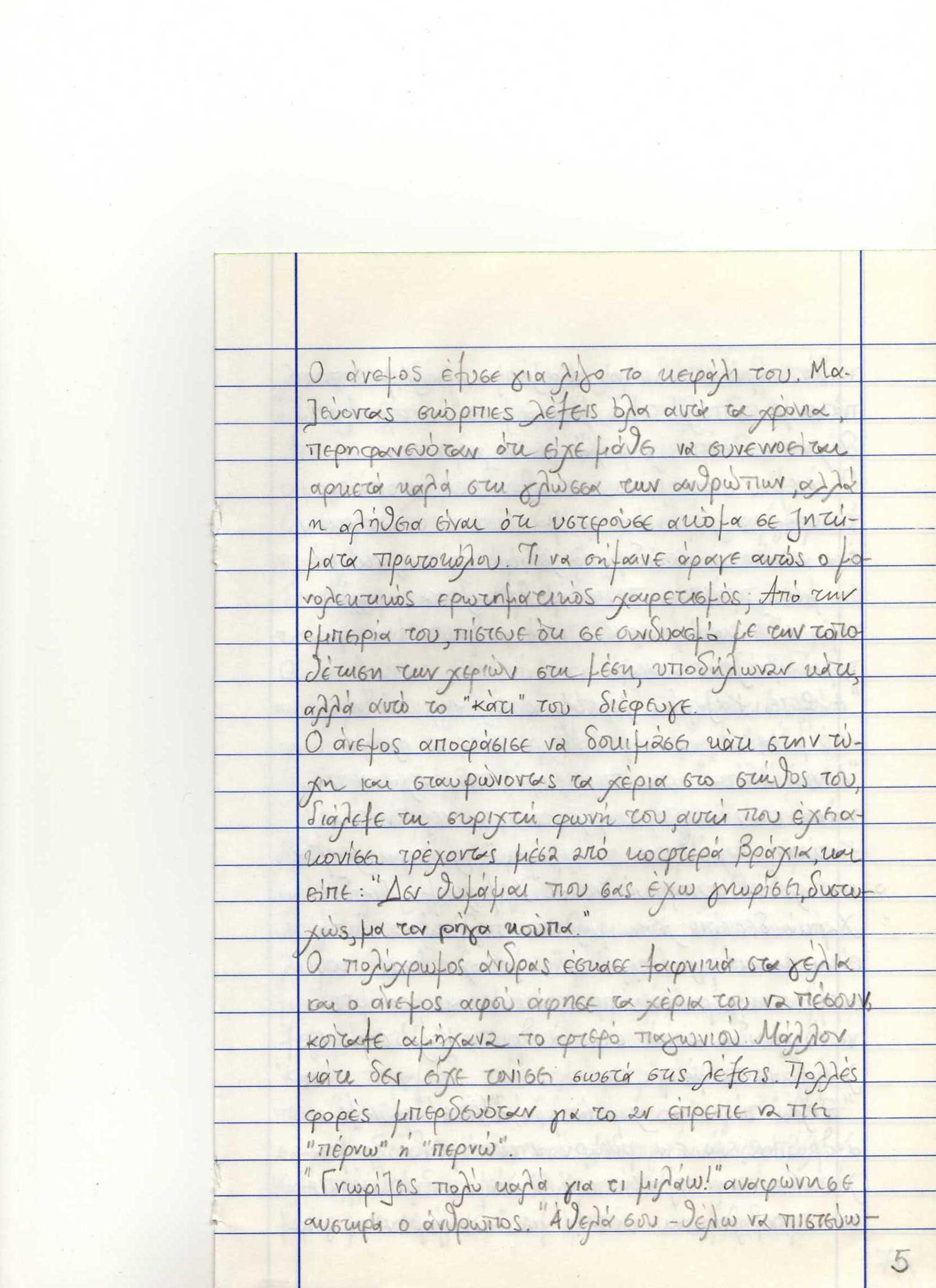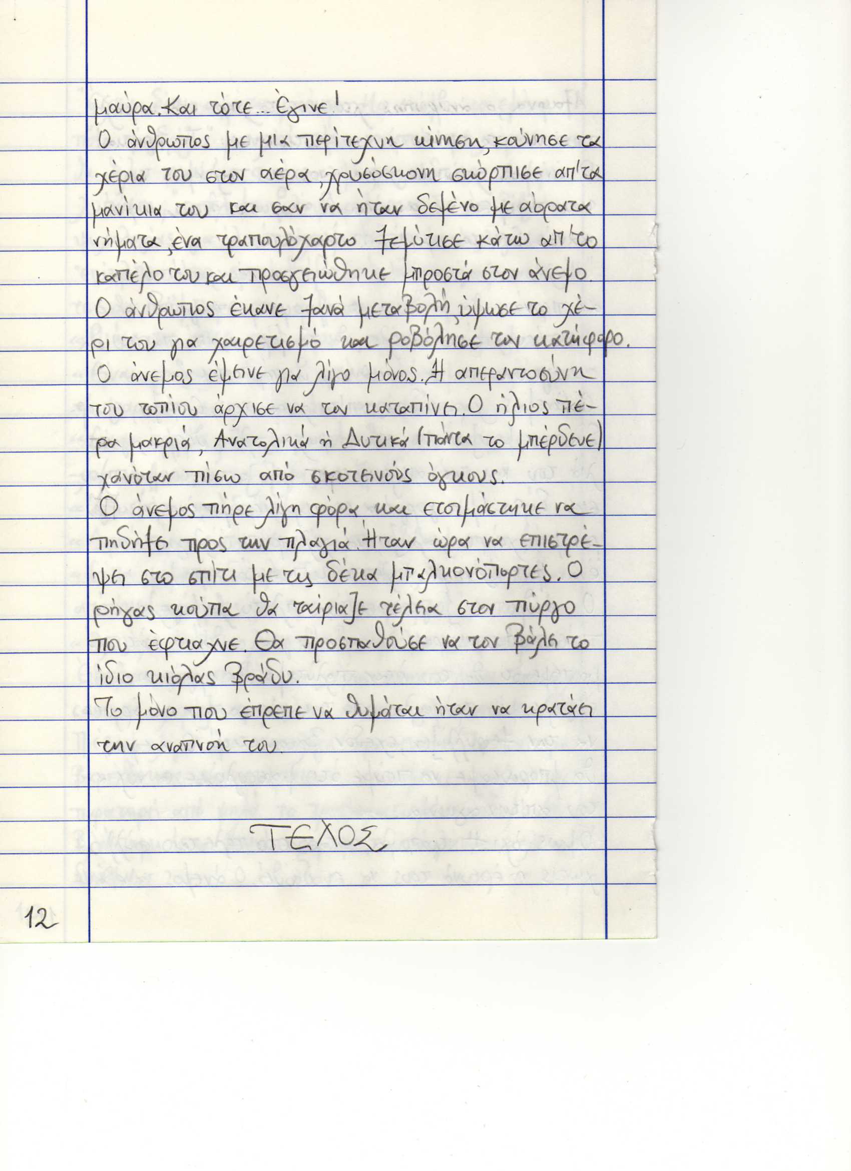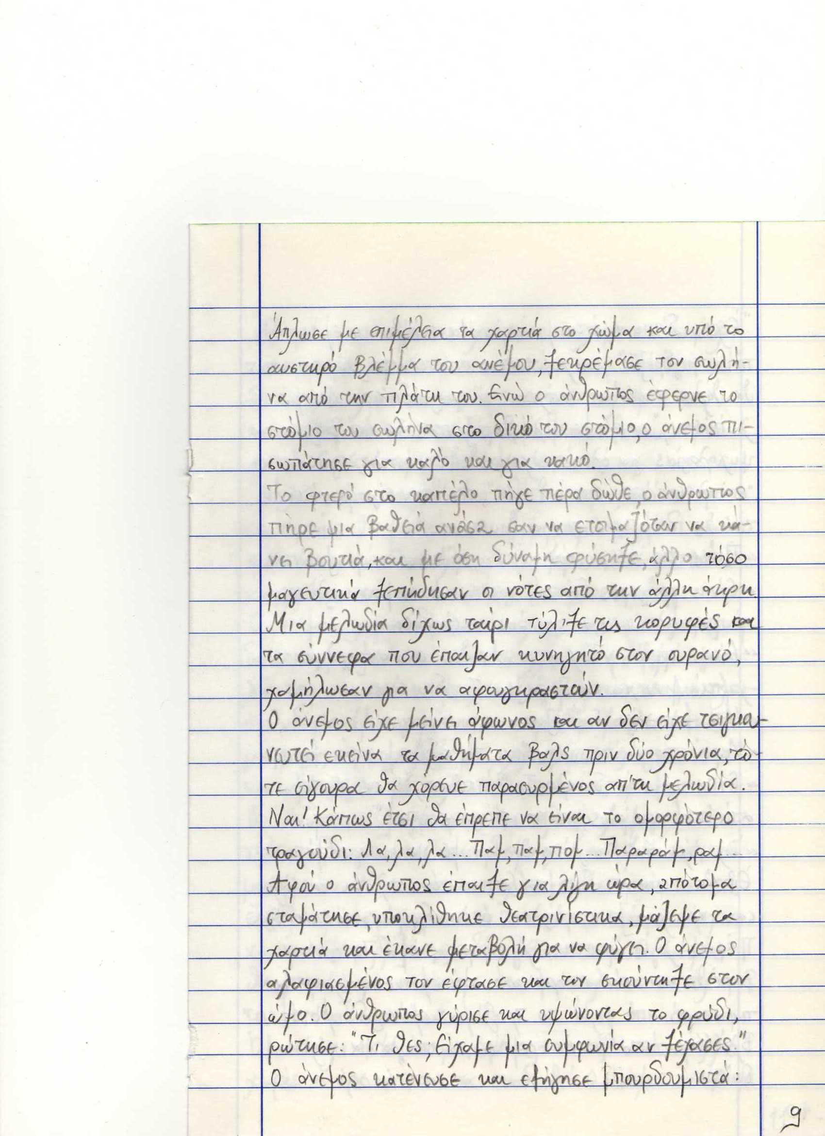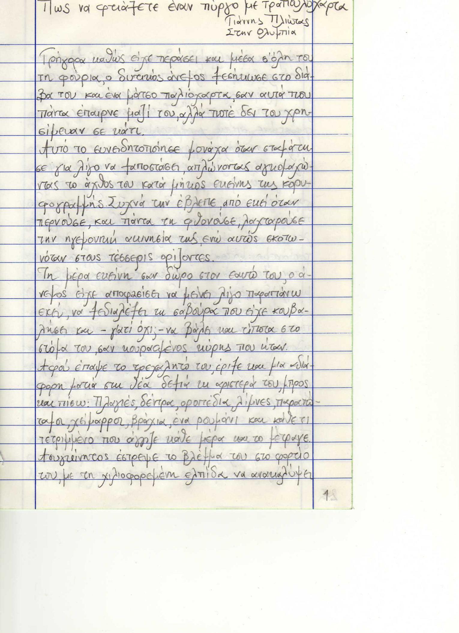 Ένα μικρό παράπονο που έχει ουσία πέρα από το πλαίσιο του διαγωνισμού είναι ότι κάποια σημεία είναι πολύ πιο εμπνευσμένα από τα υπόλοιπα και ελπίζω να το φέρεις όλο το κείμενο στο ψηλότερο από τα δυο επίπεδα όταν το περάσεις σε word.
