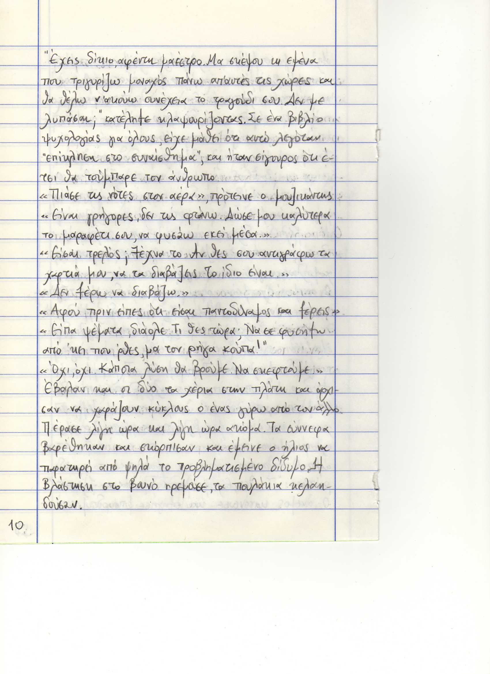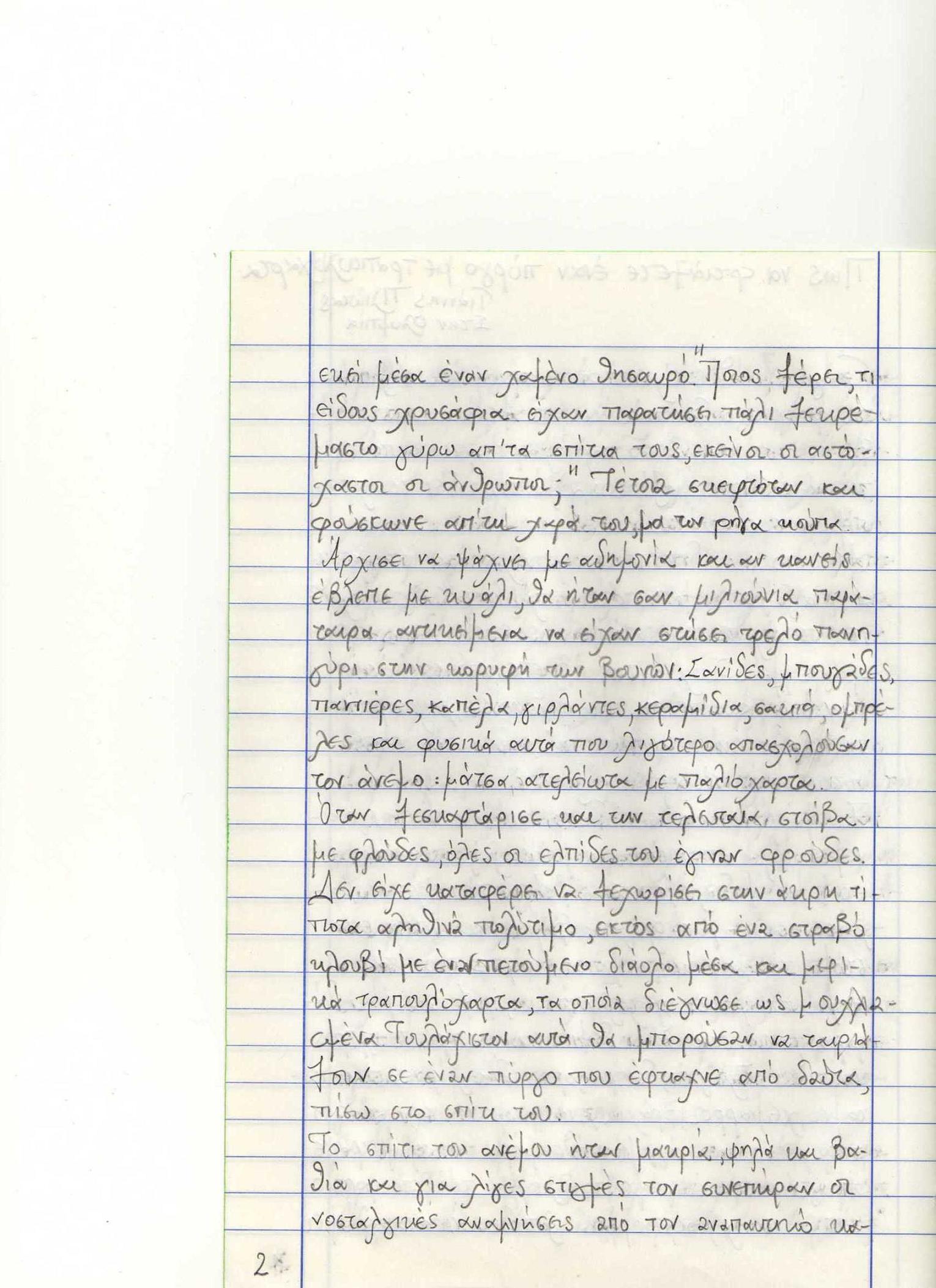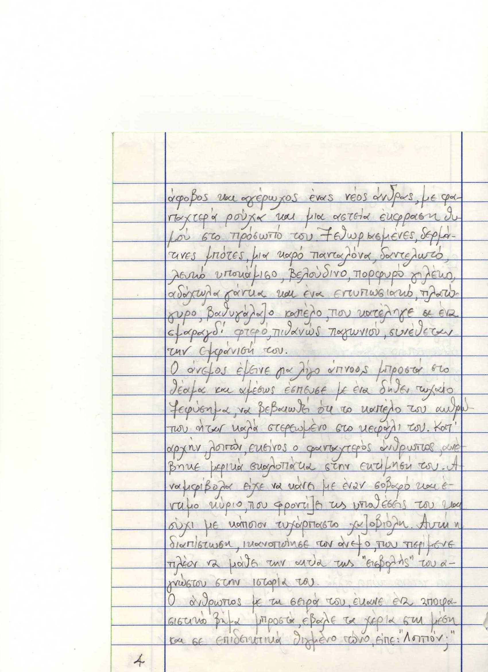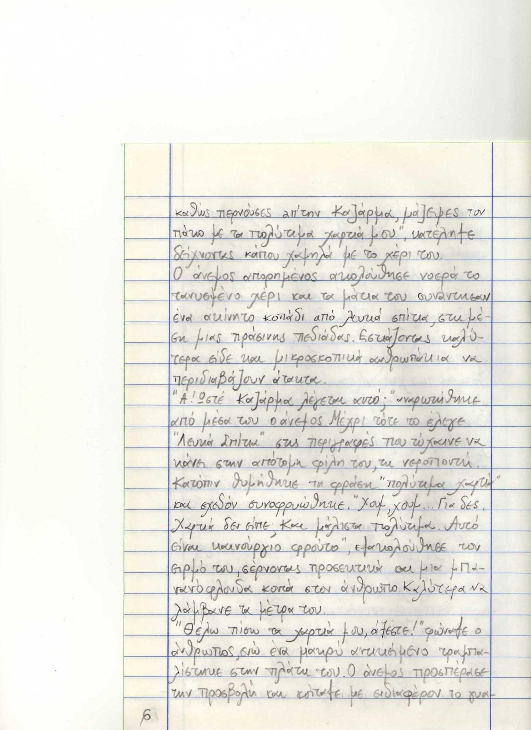 Ένα μικρό παράπονο που έχει ουσία πέρα από το πλαίσιο του διαγωνισμού είναι ότι κάποια σημεία είναι πολύ πιο εμπνευσμένα από τα υπόλοιπα και ελπίζω να το φέρεις όλο το κείμενο στο ψηλότερο από τα δυο επίπεδα όταν το περάσεις σε word.