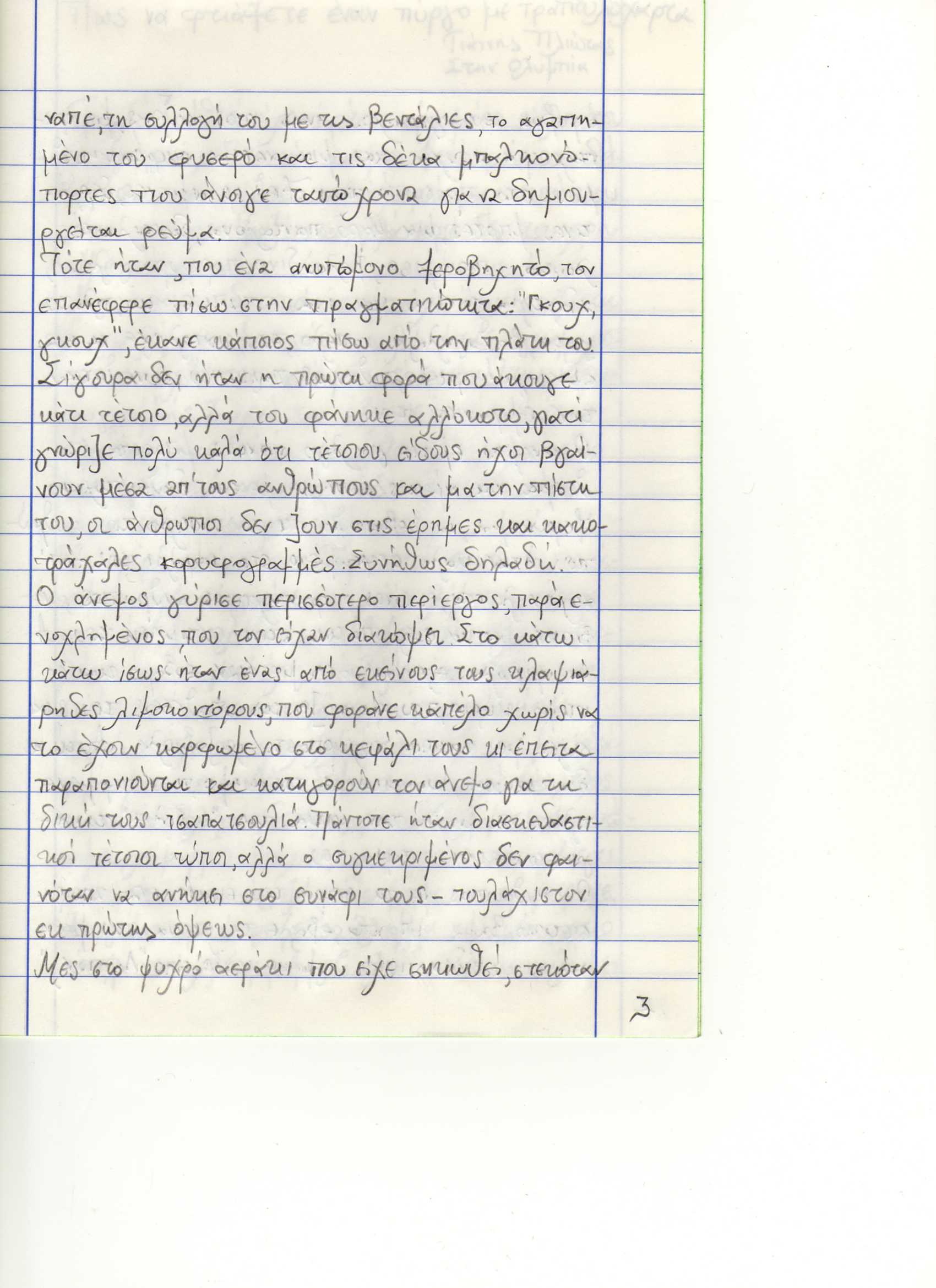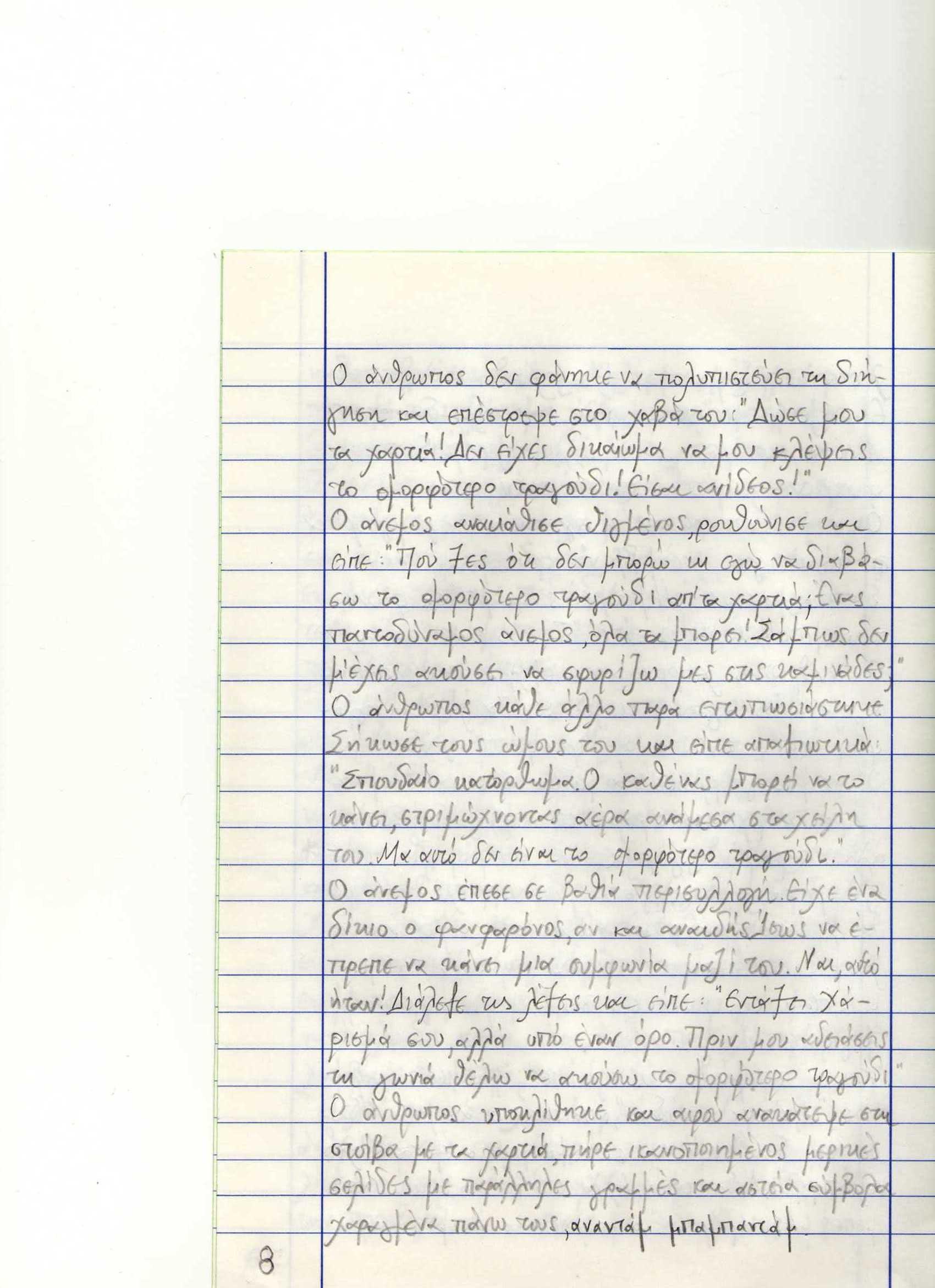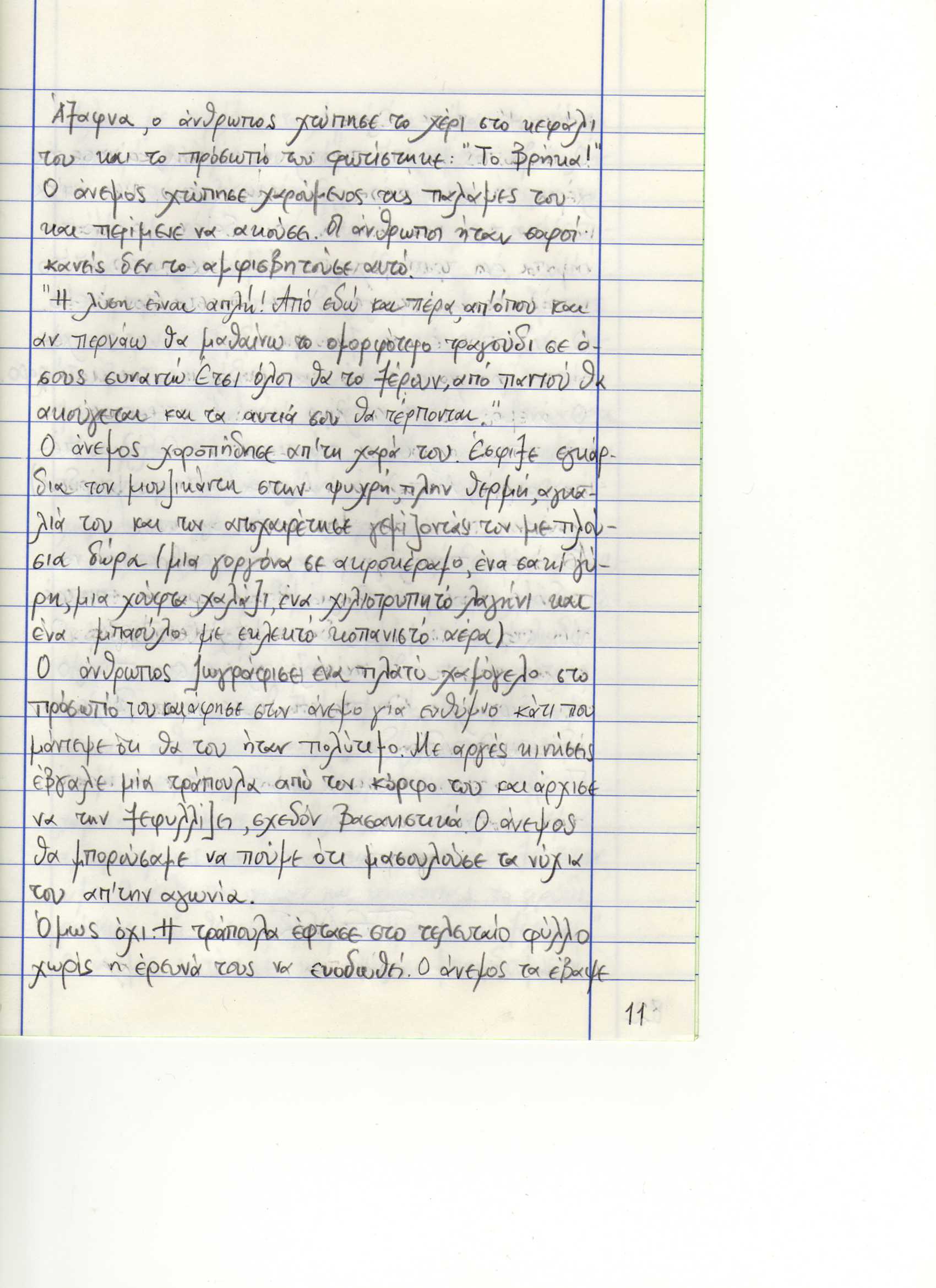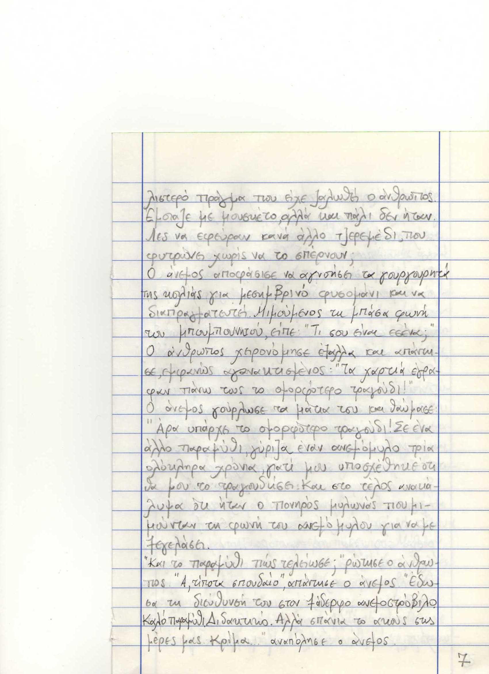 Ένα μικρό παράπονο που έχει ουσία πέρα από το πλαίσιο του διαγωνισμού είναι ότι κάποια σημεία είναι πολύ πιο εμπνευσμένα από τα υπόλοιπα και ελπίζω να το φέρεις όλο το κείμενο στο ψηλότερο από τα δυο επίπεδα όταν το περάσεις σε word.